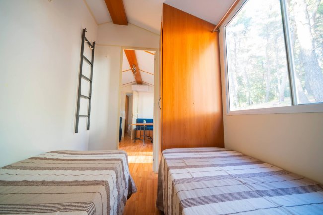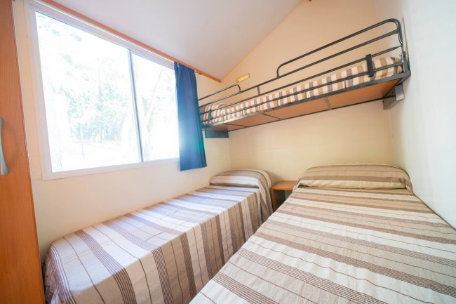 • Trilocali 5 posti: con area giorno, angolo cottura attrezzato e divano letto, camera con letto matrimoniale, camera con letto a castello, bagno con doccia e veranda esterna, aria condizionata non disponibile.