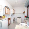 Cucina con mobili in legno, tavolo bianco con cestino di frutta, porta aperta vista mare.