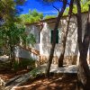 Casa bianca circondata da vegetazione, con pietra e tetto in terracotta, vista esterna.