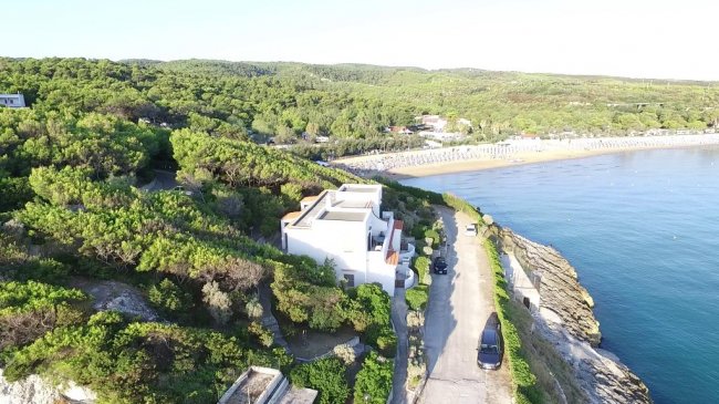 Villa bianca con tetto in tegole rosse, circondata da pini, vista sul mare.